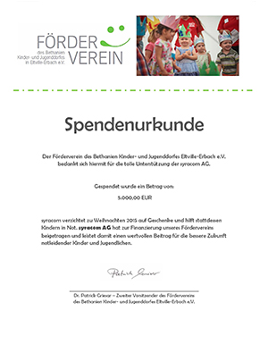 In 2015, syracom decided not to give Christmas presents. Instead, the consultancy decided to once again help children in need. The budget for the gifts went to the Bethanien Kinder- und Jugenddörfer support association. Every year, the association provides almost €100,000 for school sponsorship. It also supports the purchase of equipment and materials as well as events at the children's and youth village.