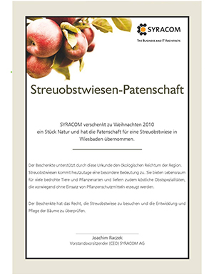 Since Christmas 2010, syracom has been the proud sponsor of a meadow orchard in Wiesbaden-Freudenberg. Under the motto "giving a piece of nature as a gift", our customers and employees were presented with a certificate of sponsorship for a meadow orchard.