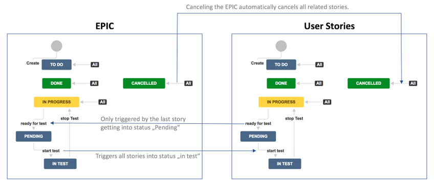 As we had been confronted with this problem for the first time and built a solution for one of our customers, it just got a cute nickname: the “The last one turns off the light” add-on. This name fast established itself, for example in workflow discovery sessions: “Oh, and here in this step, if it is the last task the Dev team worked on, can the issue turn off the light?” Within the sample distributed workflow below, the last story getting into status “pending” (for test) triggers its epic to signal “ready for test.” Now, the epic itself can trigger all related stories to start testing as all of them are ready: