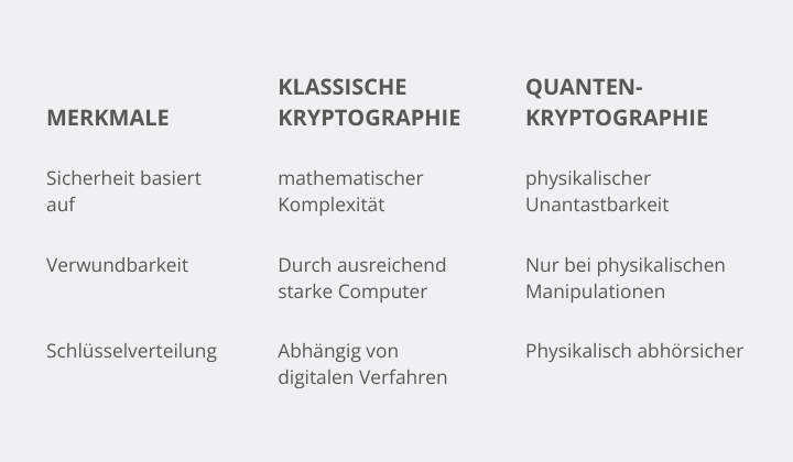 Der wichtigste Unterschied: Quantenkryptographie ist in der Theorie informationssicher – unabhängig von der Rechenleistung des Angreifers. Klassische Kryptosysteme basieren auf mathematischen Algorithmen wie RSA oder ECC. Diese könnten durch Quantencomputer gebrochen werden, da diese Algorithmen wie Shor’s Algorithmus nutzen, um mathematische Probleme in polynomieller Zeit zu lösen.