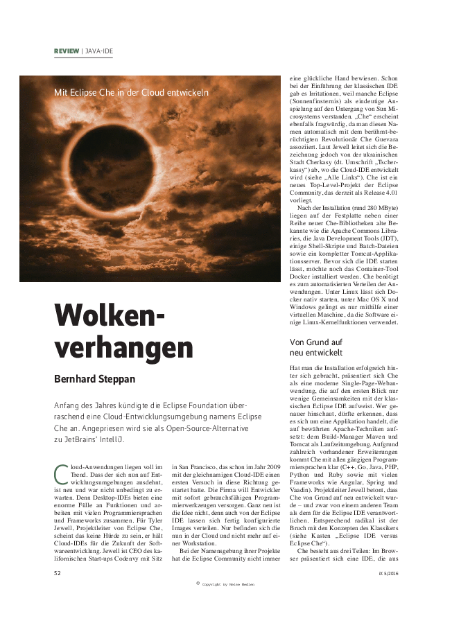 Anfang des Jahres kündigte die Eclipse Foundation überraschend eine Cloud-Entwicklungsumgebung namens Eclipse Che an. Der Artikel von Bernhard Steppan (Syracom AG) beleuchtet die Stärken und Schwächen dieser Cloud-IDE.