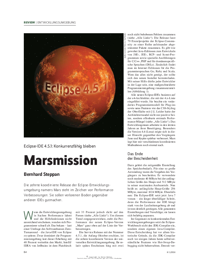 Mit der Eclipse-Version 4.5 möchte die Eclipse-Community erreichen, dass die quelloffene Entwicklungsumgebung weiterhin konkurrenzfähig bleibt. Das Review von Bernhard Steppan (Syracom AG) beleuchtet die Verbesserungen der neuen Eclipse-Version.