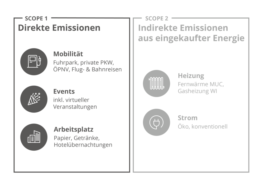 Die CO₂-Quellen unserer Wertschöpfungskette kategorisieren wir nach den Scopes des Deutschen Nachhaltigkeitskodexes. Unterschieden werden direkte (Scope 1) und indirekte Emissionen (Scope 2 und 3). Pragmatisch haben wir nach den wesentlichen CO₂-Quellen recherchiert und diese erfasst. Im Beratungsalltag verursachen wir kaum Emissionen nach Scope 3 und meist kompensieren unseren Lieferanten selbst. Somit sind Scope 3 Emissionen vernachlässigt worden. Die ermittelten CO₂-Quellen werden daraufhin untersucht, inwieweit Emissionen reduziert werden können.