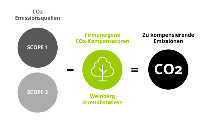 Nun rechnen wir die CO₂-Quellen aller Unternehmensaktivitäten in kg CO₂ um. Dies erfolgt mit dem CO₂-Kalkulationsschemas vom Bundesamt für Umwelt und der gemeinnützigen Organisation Naturefund. Von der berechneten Gesamtmenge ziehen wir die durch unsere Streuobstwiese und unseren Weinberg kompensierte CO₂-Menge ab. So erhalten wir jedes Jahr den syracom-CO₂-Fußabdruck.
